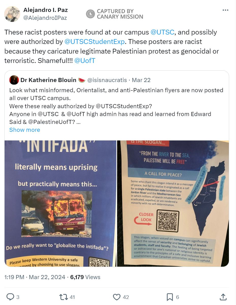 On March 22, 2024, Paz posted on Twitter referring to a tweet with photos of posters that were put up at UTSC: “...These posters are racist because they caricature legitimate Palestinian protest as genocidal or terroristic. Shameful!!! @UofT.”One of the posters showed a photo of a bus on fire and said: “‘INTIFADA’ / literally means uprising / but practically means this…” Text under the photo of the burning bus said: “Do we really want to ‘globalize the intifada?’”