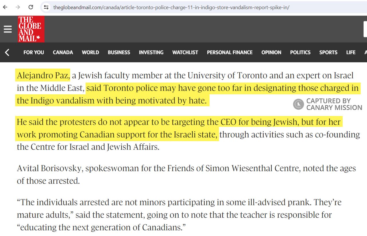 One news story about the incident reported that Paz “said Toronto police may have gone too far in designating those charged in the Indigo vandalism with being motivated by hate. He said the protesters do not appear to be targeting the CEO for being Jewish, but for her work promoting Canadian support for the Israeli state, through activities such as co-founding the Centre for Israel and Jewish Affairs.”