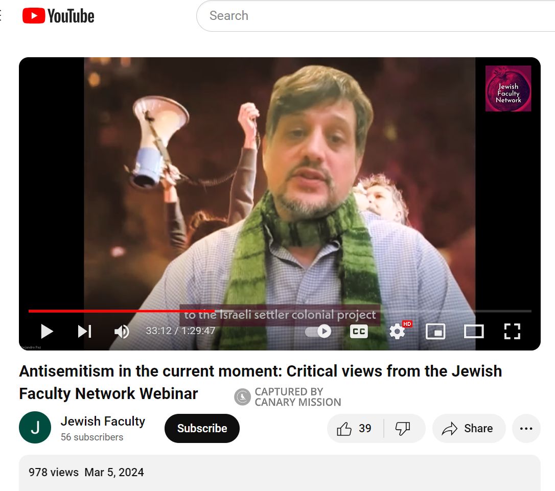 Alejandro Paz [Alejandro I. Paz] defended a pro-terror slogan and a phrase that calls for Israel’s destruction. He joined in an anti-Israel encampment at the University of Toronto (UofT) in May 2024, as a faculty member in support of protesters.Paz has also dismissed anti-Semitism and spread hatred of Israel. He is a supporter of the Boycott, Divestment, Sanctions (BDS) movement.
