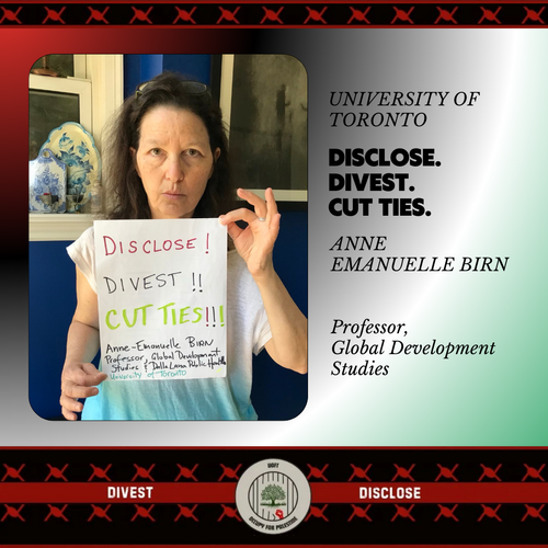 To show support, Birn submitted a “support selfie,” holding a sign that said: “DISCLOSE! DIVEST!! CUT TIES!!! Anne-Emanuelle Birn / Professor, Global Development Studies…”