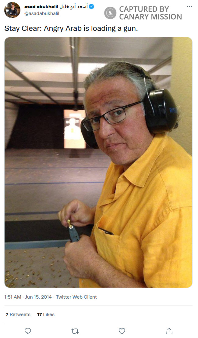 In 2012, Abukhalil told an audience that one of his greatest inspirations was Palestinian terrorist George Habash.