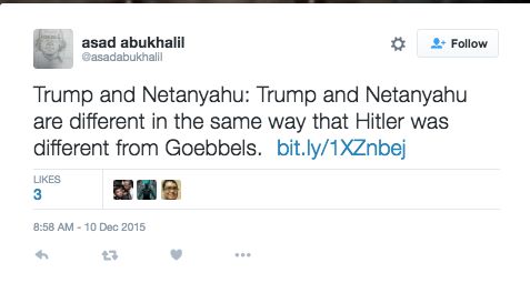 On December 10, 2015, Abukhalil tweeted — “Trump and Netanyahu: Trump and Netanyahu are different in the same way that Hitler was different from Goebbels.”