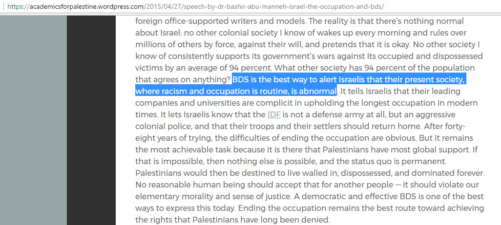 One of the demands of BDS includes [point 3] what is generally known as the “right of return,” a demand discredited as a way to eliminate Israel. Barghouti said the “right of return” is a means to “end Israel’s existence as a Jewish state.”