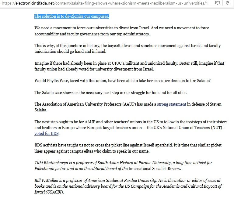 Mullen opined that members of U of I’s Board of Trustees who supported Israel or associated with others having ties to Israel were inherently biased against Salaita and wrote that “[t]he solution is to de-Zionize our campuses...” Mullen also advocated for “a militant and unionized faculty.”