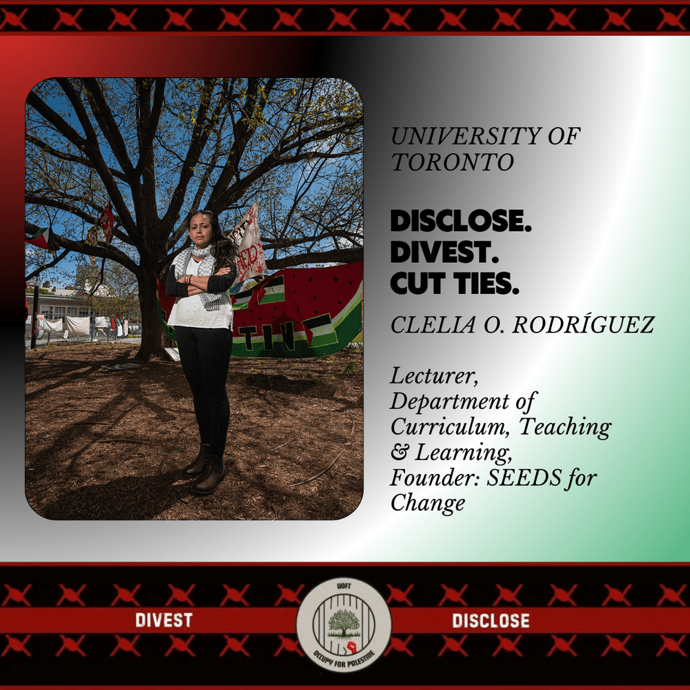 On May 25, 2024, Rodríguez tweeted the same graphic and wrote: “Join the growing list of alumni, honorary degree holders, faculty, staff and librarians demanding U of T immediately move to disclose, divest, & cut ties w/ institutions supporting genocide and apartheid https://uoftdivest,ca."