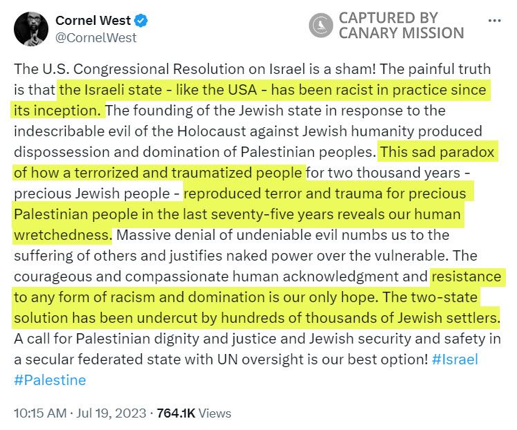 On October 7, 2023, West posted on Instagram: “STATEMENT FROM CORNEL WEST FOR PRESIDENT: / Dr. Cornel West Calls for Immediate Cessation of Violence in the Holy Land and for an End to the Illegal Occupation of Palestinians. Urges Western Colonial Powers to Be Conscious of Their Rhetoric and to Push for Peace, Not War / Saturday, October 7, 2023.”On October 7, 2023, Hamas murdered approximately 1,200 Israelis, kidnapped hundreds and wounded thousands. War crimes included mass rape and torture. Israel retaliated with a war called “Swords of Iron.” For more information, see the Canary Mission page on Hamas.