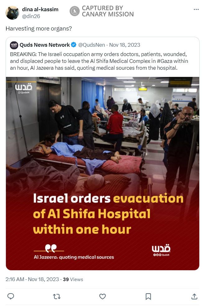 On November 18, 2023, Al-Kassim tweeted: “Harvesting more organs?” Her tweet included a Quds News Network article about the evacuation of Al-Shifa hospital in Gaza.
