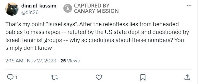 On November 27, 2023, Al-Kassim tweeted: “That's my point ‘Israel says’. After the relentless lies from beheaded babies to mass rapes -- refuted by the US state dept and questioned by Israeli feminist groups -- why so credulous about these numbers? You simply don't know.”Denial of the Hamas war crimes of October 7, 2023, among anti-Israel activists has been likened to Holocaust denial among neo-Nazis.