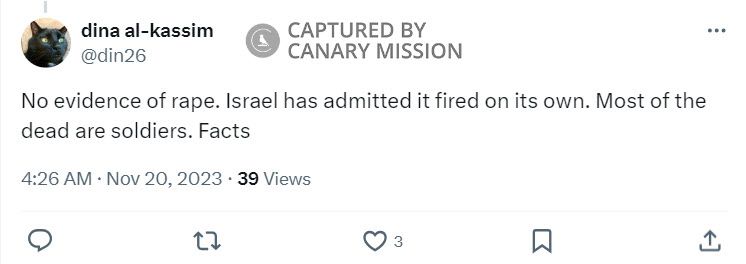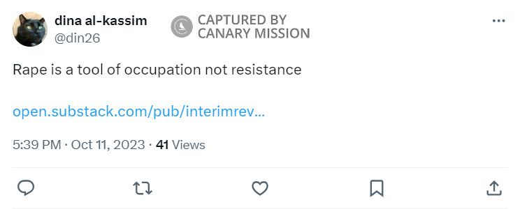 On October 11, 2023, Al-Kassim tweeted: “Rape is a tool of occupation not resistance”.