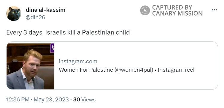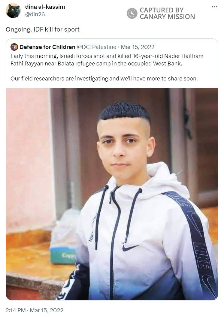 On March 15, 2022, Al-Kassim tweeted: “Ongoing. IDF [Israel Defense Forces] kill for sport.” She was referring to Palestinian Islamic Jihad (PIJ) terrorist operative Nader Haitham Fathi Rayan, who was killed during an arrest raid.