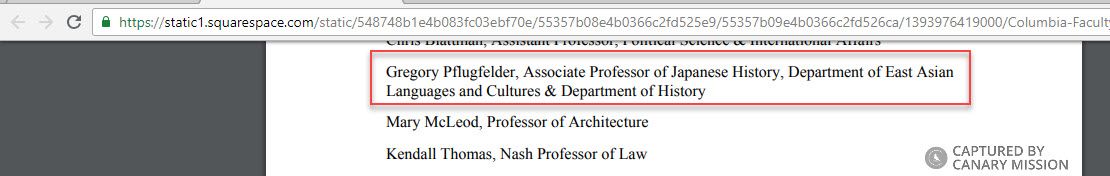 Gregory Pflugfelder is a supporter of the Boycott, Divestment, Sanctions (BDS) movement and is an associate professor of Japanese History in the Department of East Asian Languages and Cultures and in the Department of History at Columbia University (Columbia).Supporting BDS