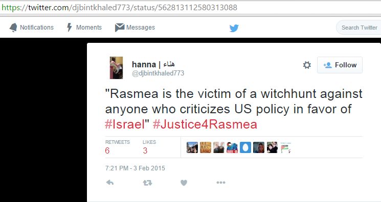 On February 3, 2015 Alshaikh tweeted: "Rasmea is the victim of a witchhunt against anyone who criticizes US policy in favor of #Israel" #Justice4Rasmea."