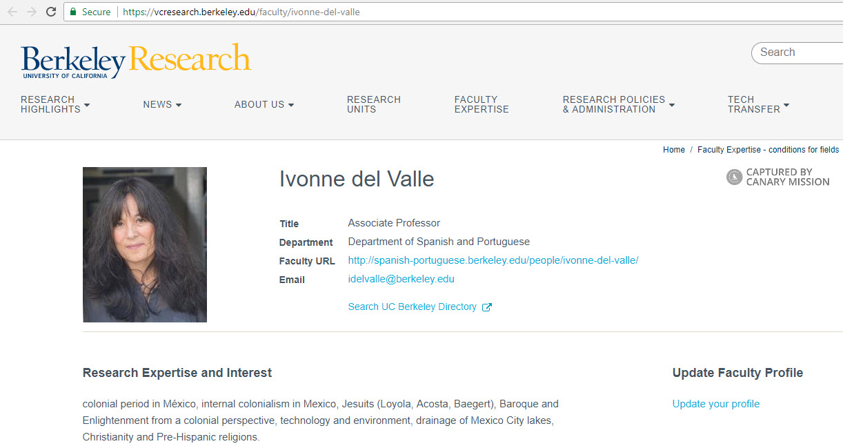 Ivonne del Valle is a supporter of the Boycott, Divestment, Sanctions (BDS) movementand has defended anti-Zionism on campus, as well as disgraced anti-Israel Professor Steven Salaita.As of January 2020, Del Valle was an associate professor in the Department of Spanish and Portuguese at the University of California, Berkeley (UC Berkeley).