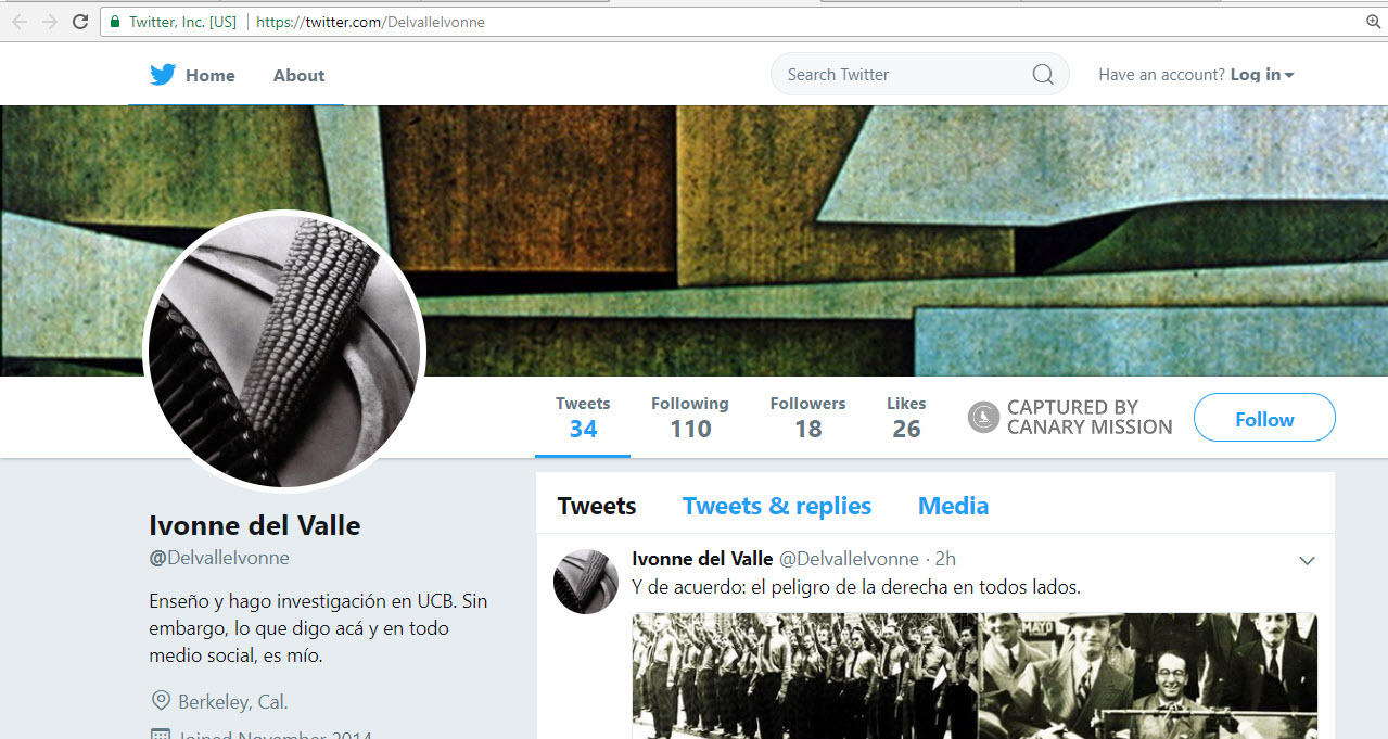 In 2016, del Valle signed an open letter calling for the academic boycott of Israel.The open letter was addressed to the Modern Language Association (MLA), “calling on the association to pass a resolution endorsing the boycott of Israeli academic institutions.”