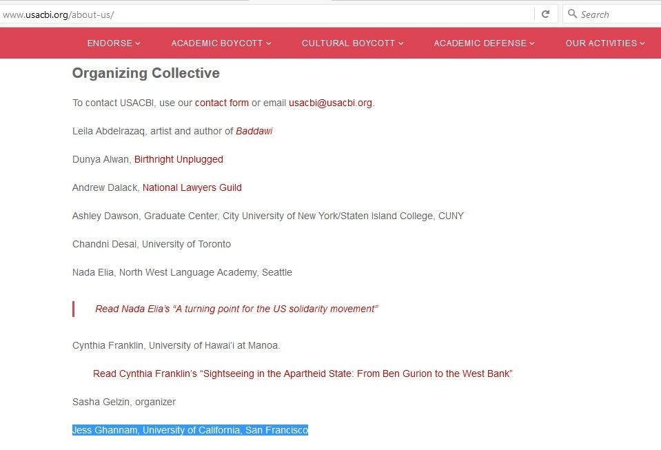 Jess Ghannam is a promoter of the Boycott, Divestment, Sanctions (BDS) movement and a member of the US Campaign for the Academic and Cultural Boycott of Israel (USACBI) Organizing Collective.