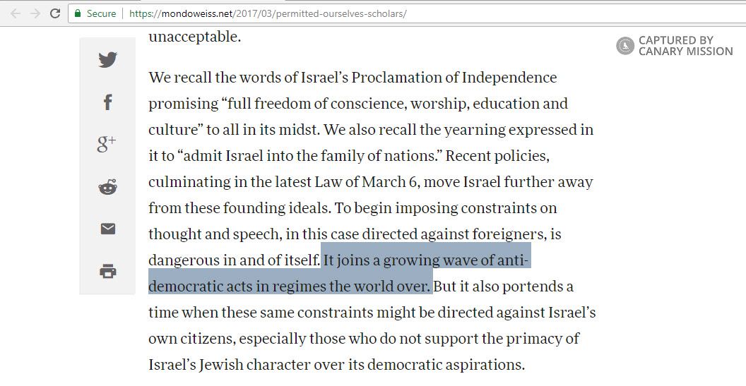 Carr signed an open letter condemning anti-BDS initiatives in Israel.The letter, signed by Jewish scholars and published by Mondoweiss on March 12, 2017, condemned the Israeli government’s anti-BDS legislation.