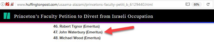On November 5, 2014, Waterbury signed a petition entitled "An Invitation to the Tenured Faculty at Princeton" that was featured in Princeton’s student newspaper, The Daily Princetonian. The petition invited tenured faculty to support divestment from companies “that contribute to or profit from the Israeli occupation of the West Bank until the State of Israel complies with UN Resolution 242, ends its military occupation of the West Bank and lifts its siege of Gaza.”