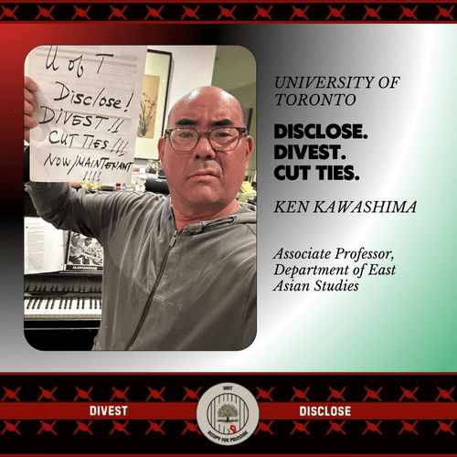 As of June 2024, UofT professor Ken Kawashima showed his support for the encampment by signing on to a statement put out by UofT community members as part of the Boycott, Divestment, Sanctions (BDS) movement.