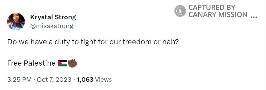 On October 7, 2023, Strong tweeted: “Do we have a duty to fight for our freedom or nah? / Free Palestine