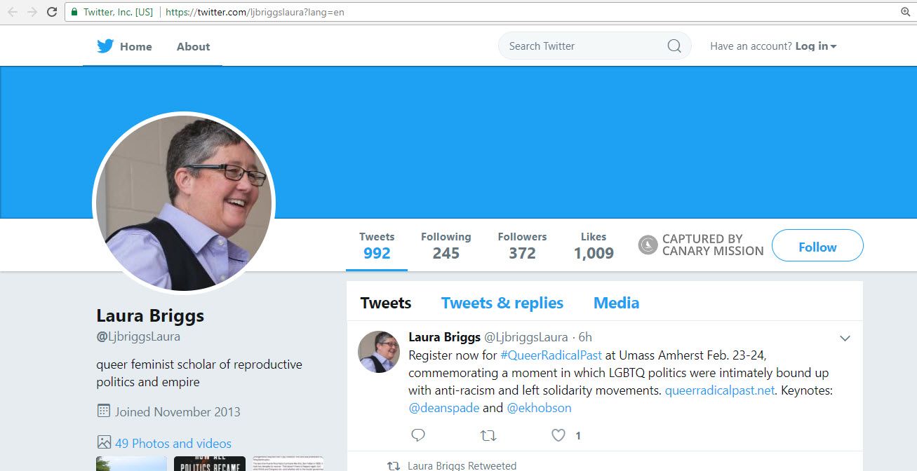 Laura Briggs [Laura J. Briggs] has demonized Israel and is a supporter of the Boycott, Divestment, Sanctions (BDS) movement.She is professor and chair of Women, Gender, Sexuality Studies at the University of Massachusetts, Amherst (UMass Amherst).