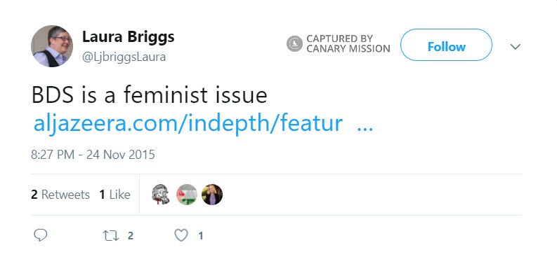 On November 13, 2015, Briggs sent out several tweets quoting anti-Israel activist and professor, Jasbir Puar.In her first tweet, Briggs wrote “J. Puar: Israel in W Bank is not archaic, only in 20th c could such a concatenation of technology, capital, and maiming take place.”
