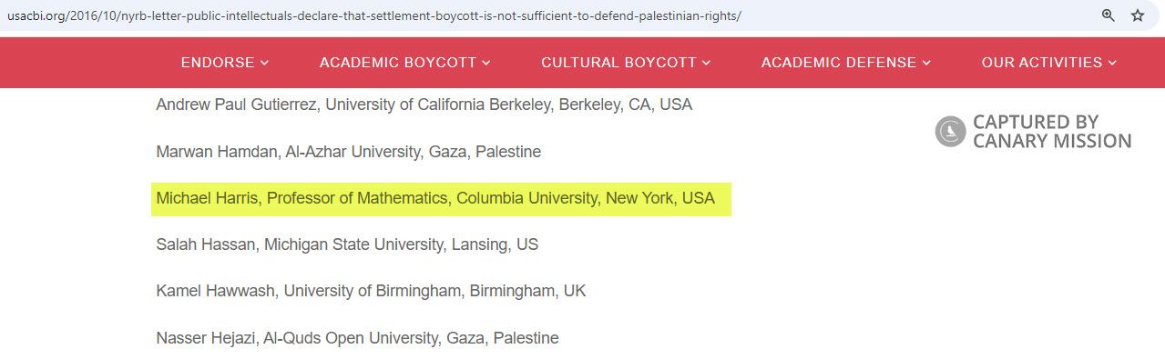 Michael Harris is a supporter of the Boycott, Divestment, Sanctions (BDS) movement.As of September 2024, Harris was listed on the Columbia website as a professor of mathematics.