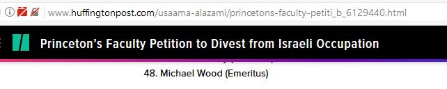 Michael Wood supports the Boycott, Divestment, Sanctions (BDS) movement at Princeton University (Princeton), where he is professor emeritus of English and Comparative Literature.Demonizing Israel