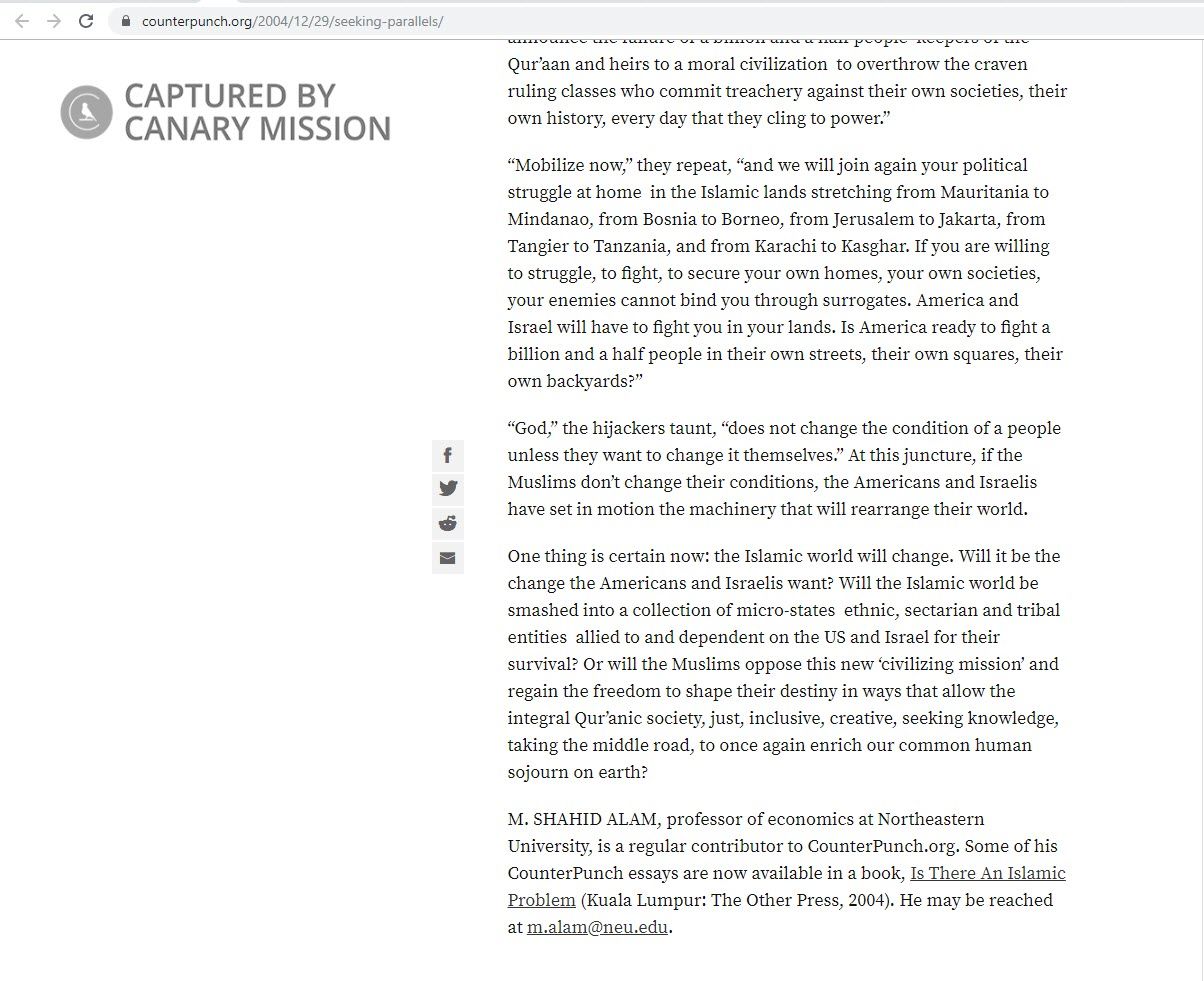 Muhammad Shahid Alam has whitewashed anti-Semitism, justified terrorism, demonized Zionism and promoted hatred of Israel. He is also a supporter of the Boycott, Divestment, Sanctions (BDS) movement.As of October 2019, Alam was listed as a Professor of Economics at Northeastern University (Northeastern) and as the faculty adviser to two student clubs: Students for Justice in Palestine (SJP) and Political Economy Forum.