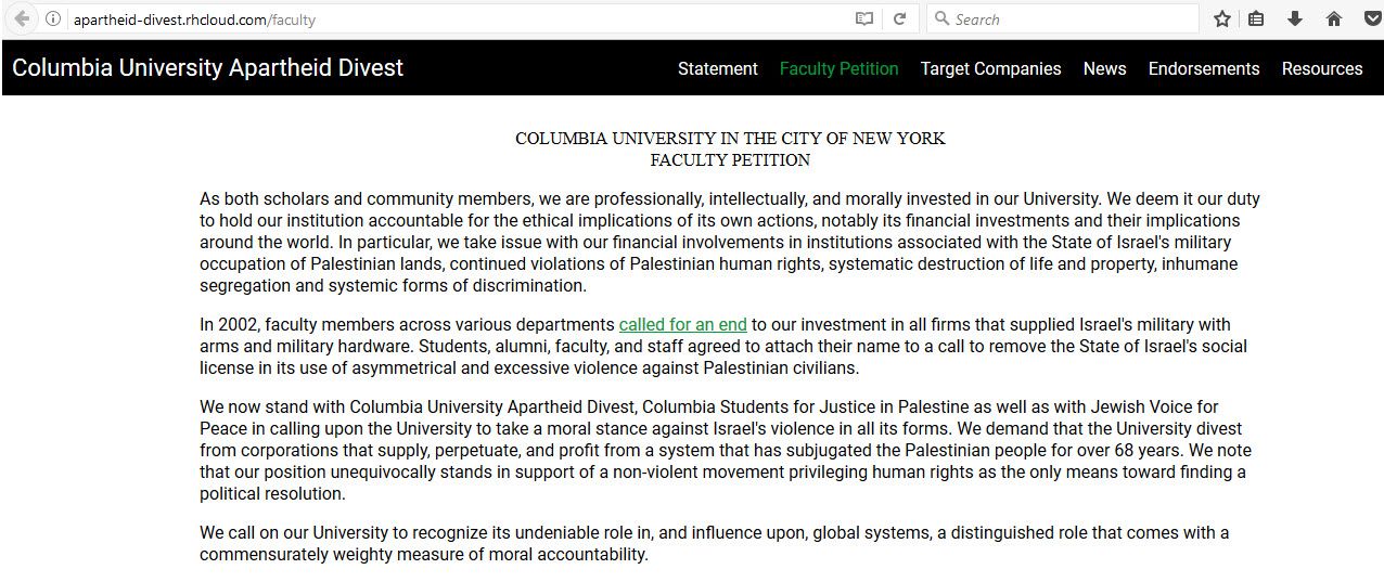 In March of 2016, Al-Musawi signed a petition created by a Columbia student initiative to rebrand BDS at Columbia as Columbia University Apartheid Divest (CUAD).CUAD is comprised of Jewish Voice for Peace (JVP) and Students for Justice in Palestine (SJP) members, who joined forces in February 2016. The group called on Columbia to divest its equity holdings and endowment funds from companies that “profit from the State of Israel’s ongoing system of settler colonialism, military occupation, and apartheid law.”