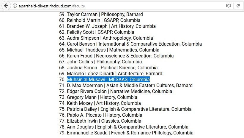 Muhsin Al-Musawi is a supporter of the Boycott, Divestment, Sanctions (BDS) movement at Columbia University (Columbia), where he is a professor of Arabic Literature.In December of 2012, Al-Musawi signed a statement against UC Berkeley Chancellor Nicholas Dirks, a former vice president of Columbia's Faculty of Arts and Sciences, for raising questions about the BDS campaign at Columbia.