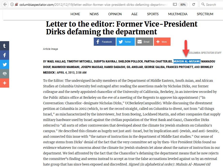In December 2012, Al-Musawi signed a statement against UC Berkeley Chancellor Nicholas Dirks, a former vice president of Columbia's Faculty of Arts and Sciences, for raising questions about the BDS campaign at Columbia.In November 2012, Dirks gave an interview in which he implied that a 2002 Columbia divestment campaign was a factor in creating a difficult atmosphere for Jewish students at Columbia.