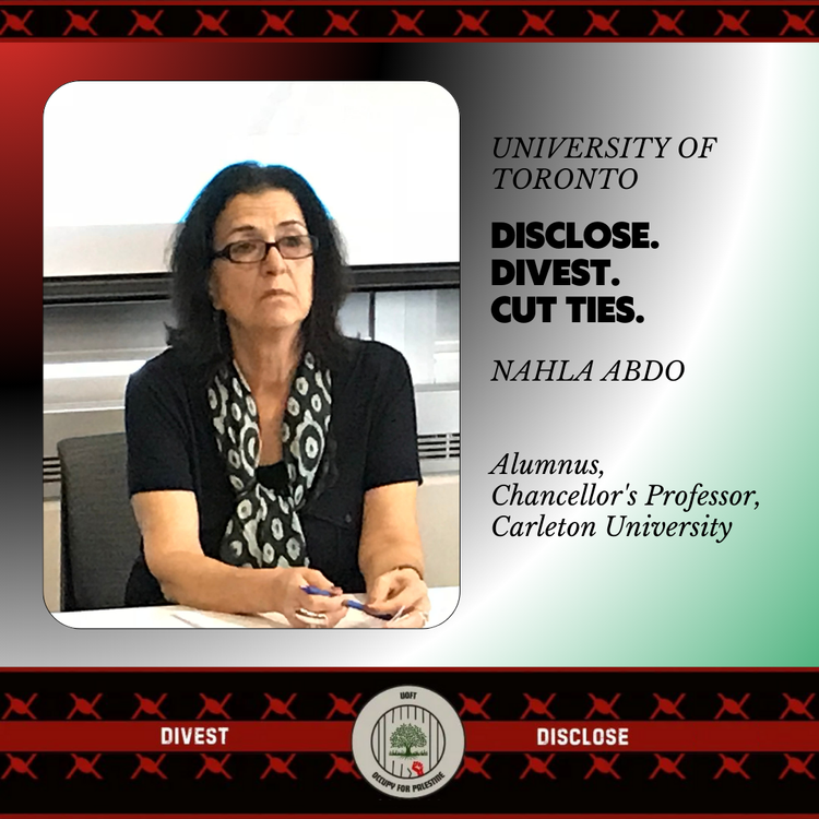 As of July 2024, university professor Nahla Abdo showed support for the encampment by signing on to a statement put out by UofT community members. The May 20, 2024 statement was part of the Boycott, Divestment, Sanctions (BDS) movement.