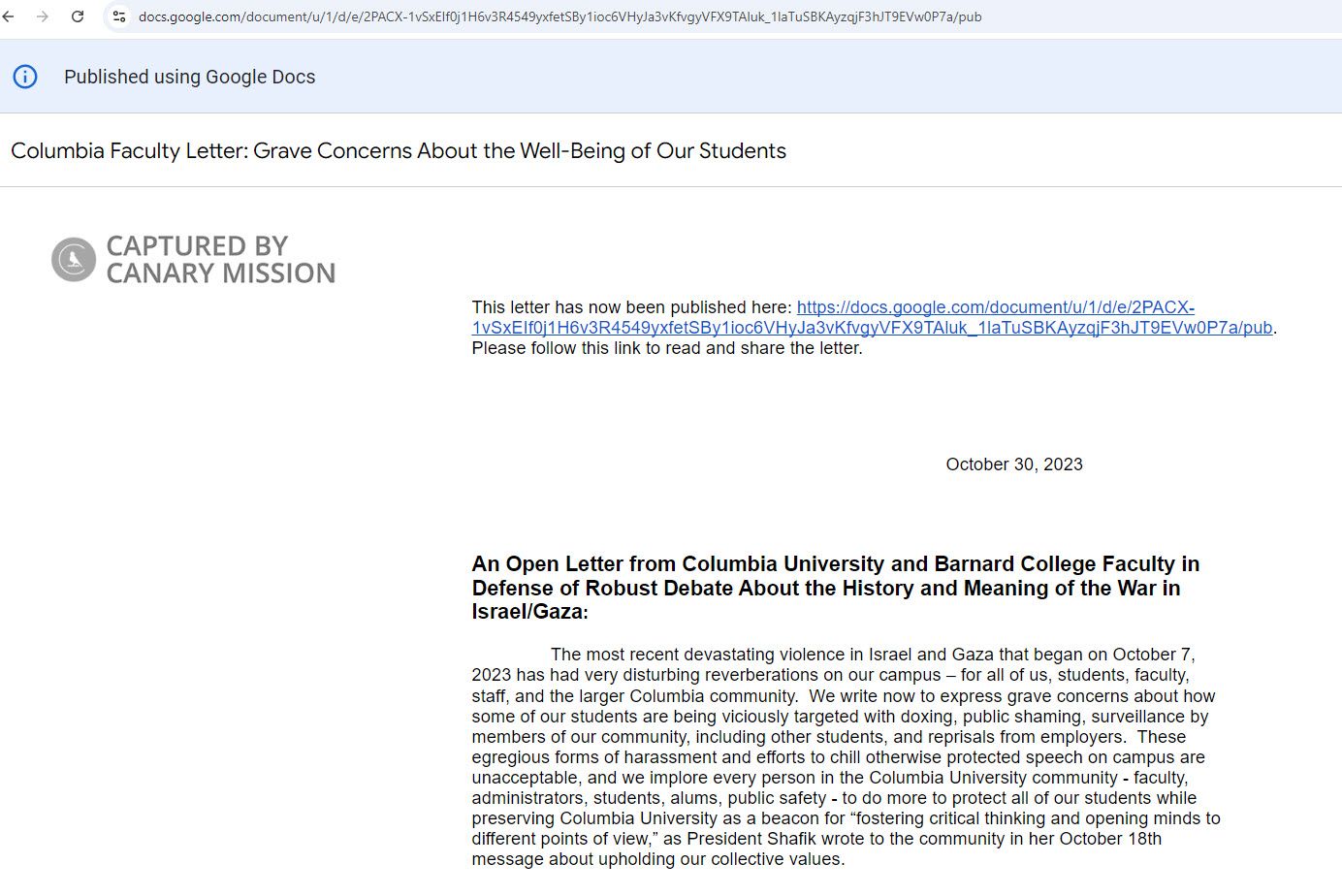 The letter Tadiar signed also defended [p. 1] the Columbia students who had signed on to their joint statement, claiming the students’ document “situated the military action begun on October 7th within the larger context of the occupation of Palestine by Israel.”
