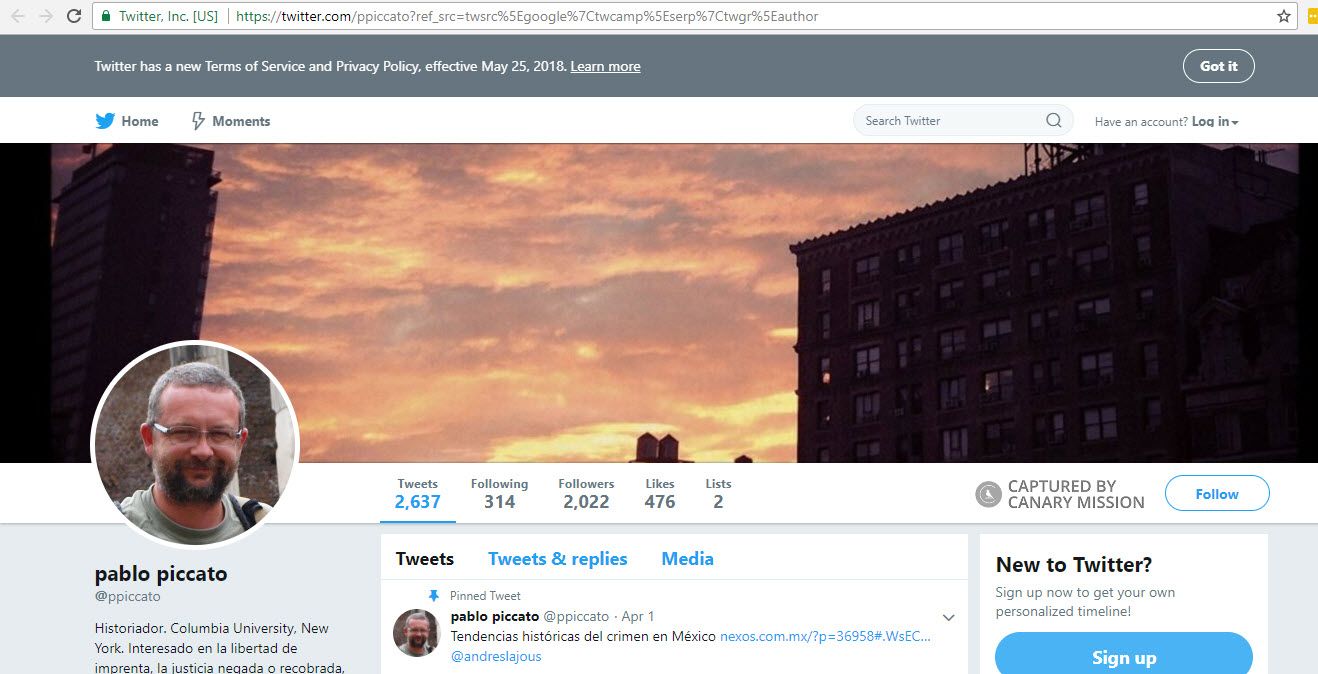 Pablo Piccato petitioned Columbia University (Columbia) President Lee Bollinger to take a position against Israel, demonized Israel and is a supporter of the Boycott, Divestment, Sanctions (BDS) movement.He is a professor in the Department of History at Columbia.