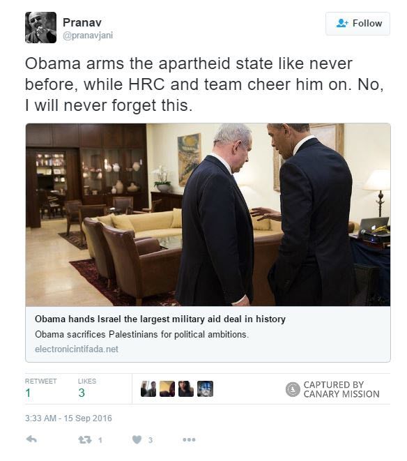 On September 28, 2016, Jani posted on Facebook that he is “Proud to be included among these academics” who signed a statement attacking Canary Mission.