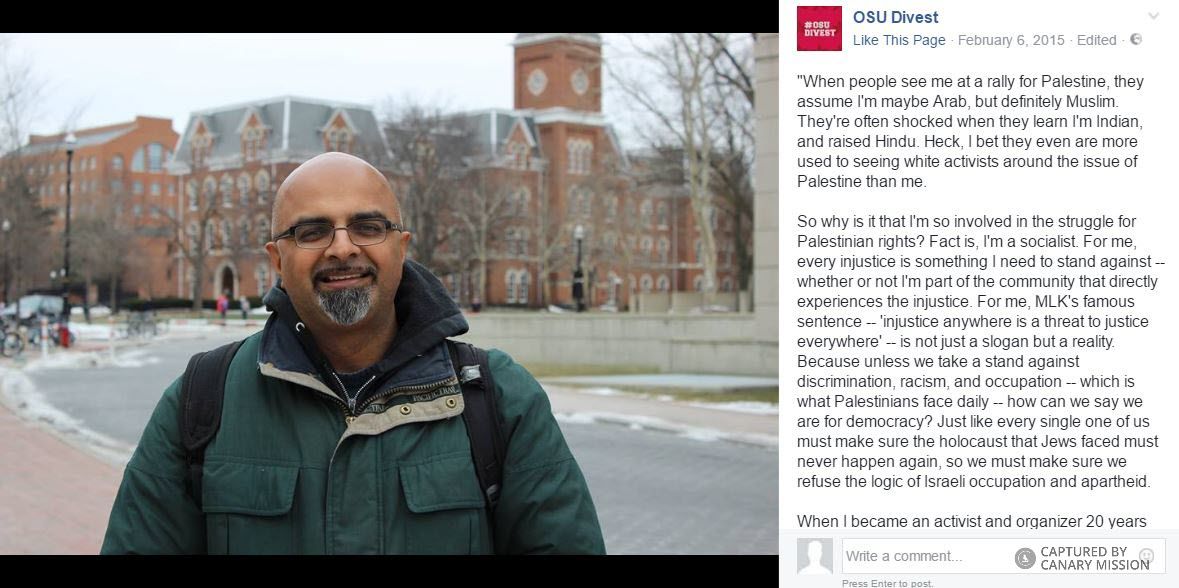 Pranav Jani has expressed support for terrorists, promoted violent protesters, as well as anti-Israel agitators and is a supporter of the Boycott, Divestment, Sanctions (BDS) movement.Jani was the 2015 faculty advisor for the Committee for Justice in Palestine (CJP) at Ohio State University (OSU) and continued to work with the group in 2019. Students for Justice in Palestine (SJP) at OSU (SJP OSU) was formerly known as the CJP until 2016.