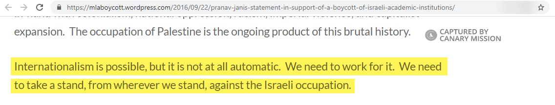 Jani concluded his statement to the MLA, writing: “Internationalism is possible, but it is not at all automatic.We need to work for it.We need to take a stand, from wherever we stand, against the Israeli occupation.”