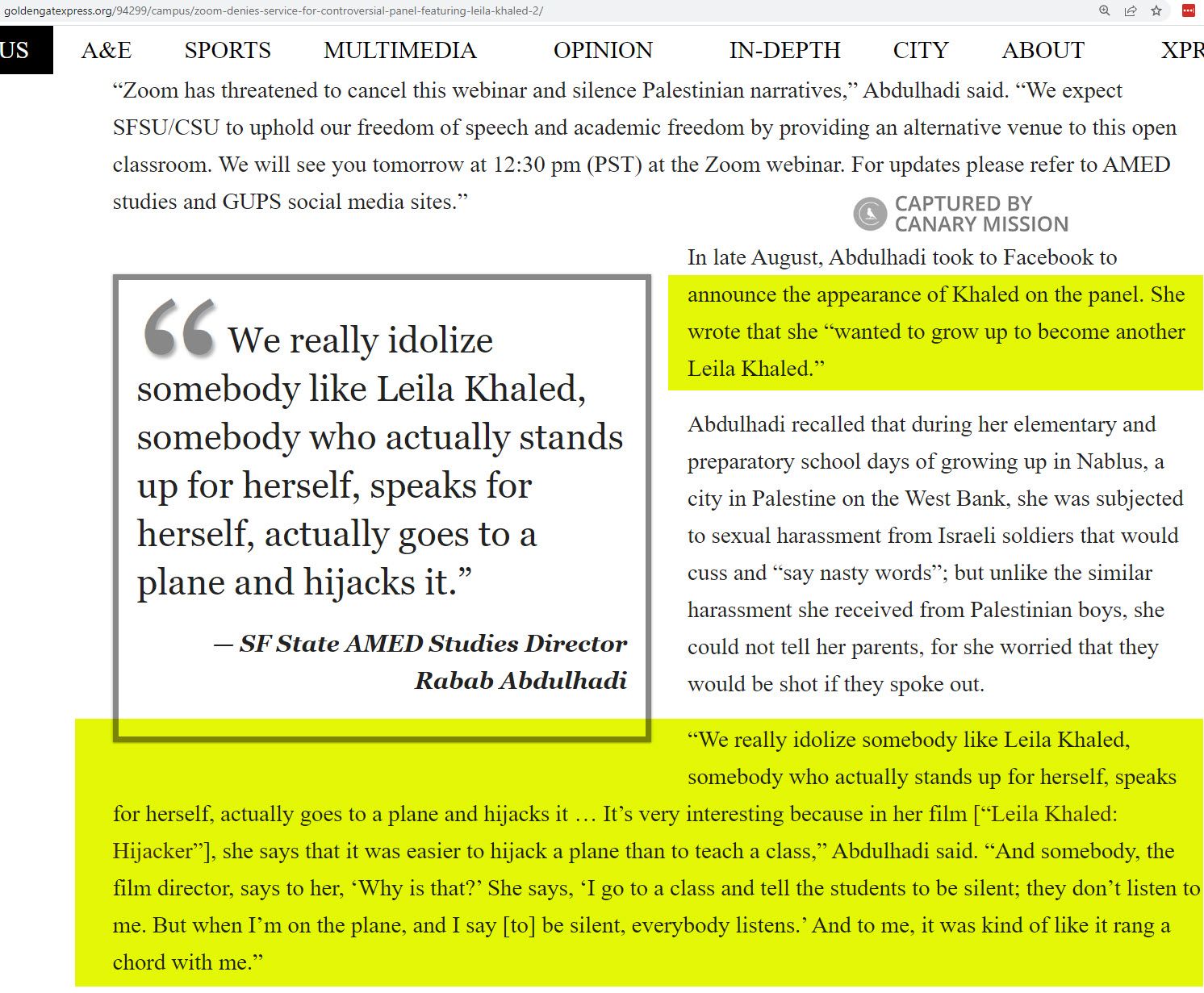 On September 22, 2020, Abdulhadi was quoted as saying: “We really idolize somebody like Leila Khaled, somebody who actually stands up for herself, speaks for herself, actually goes to a plane and hijacks it …”