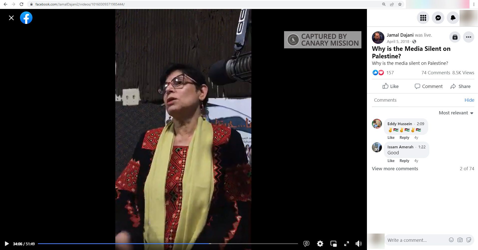 On July 2, 2017, Abdulhadi shared a post on Facebook in support of Saafin and PFLP leader Khalida Jarrar. Abdulhadi wrotethat they were “prisoners of conscience” whose arrest demonstrated “the poverty of thought, the lazy intellectual engagement and most dangerously the Orientalist, Islamophobic, racist and Zionist agenda...”