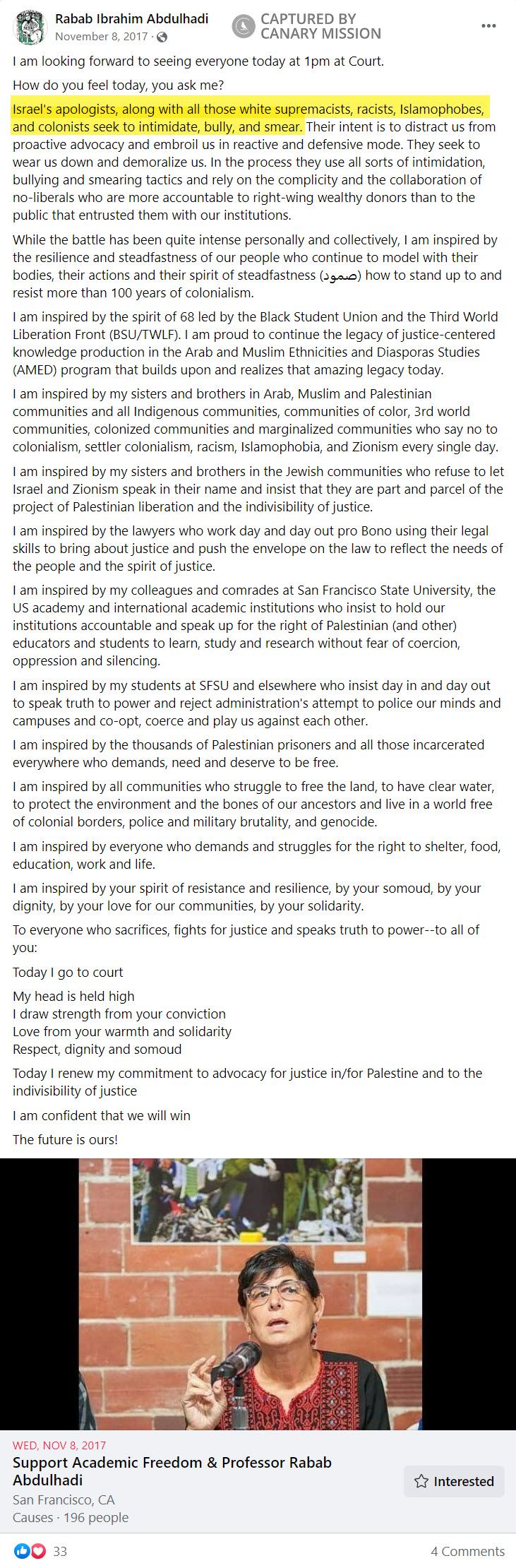 On November 8, 2017, Abdulhadi wrote on Facebook: “...Israel’s apologists, along with all those white supremacists, racists, Islamophobes, and colonists seek to intimidate, bully, and smear…”On February 23, 2018, Abdulhadi wrote Facebook in opposition to SFSU president Leslie Wong promising: “Let me be clear: Zionists are welcome on our campus.”