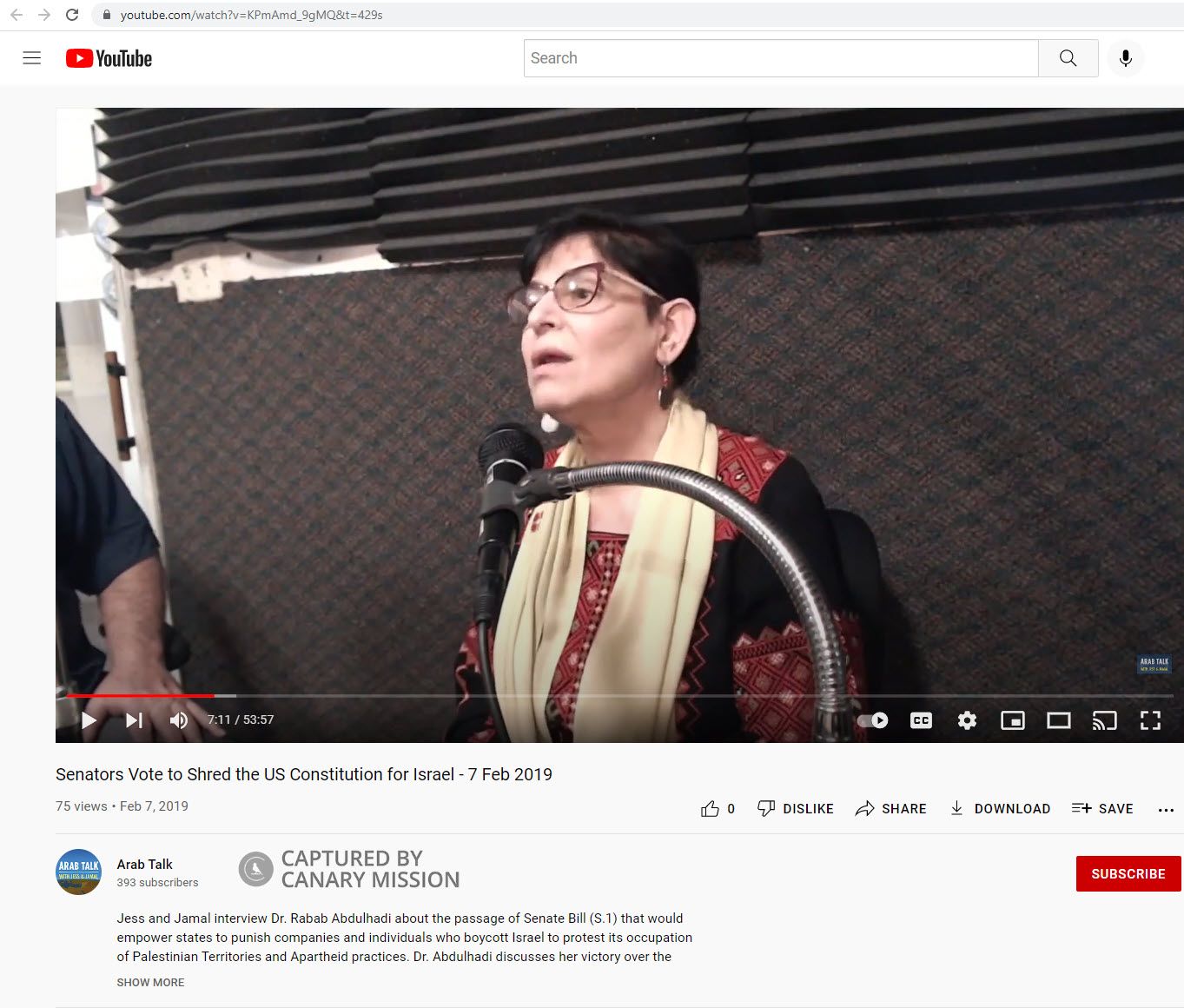 In a February 7, 2019 interview with Arab Talk, Abdulhadi condemned U.S. pro-Israel advocacy groups, saying [00:07:09]: “These groups are bullies...they push around in Congress and they bribe them, and they give them money, they twist their arms and so on, there are used to basically silencing everybody and crushing everybody.”