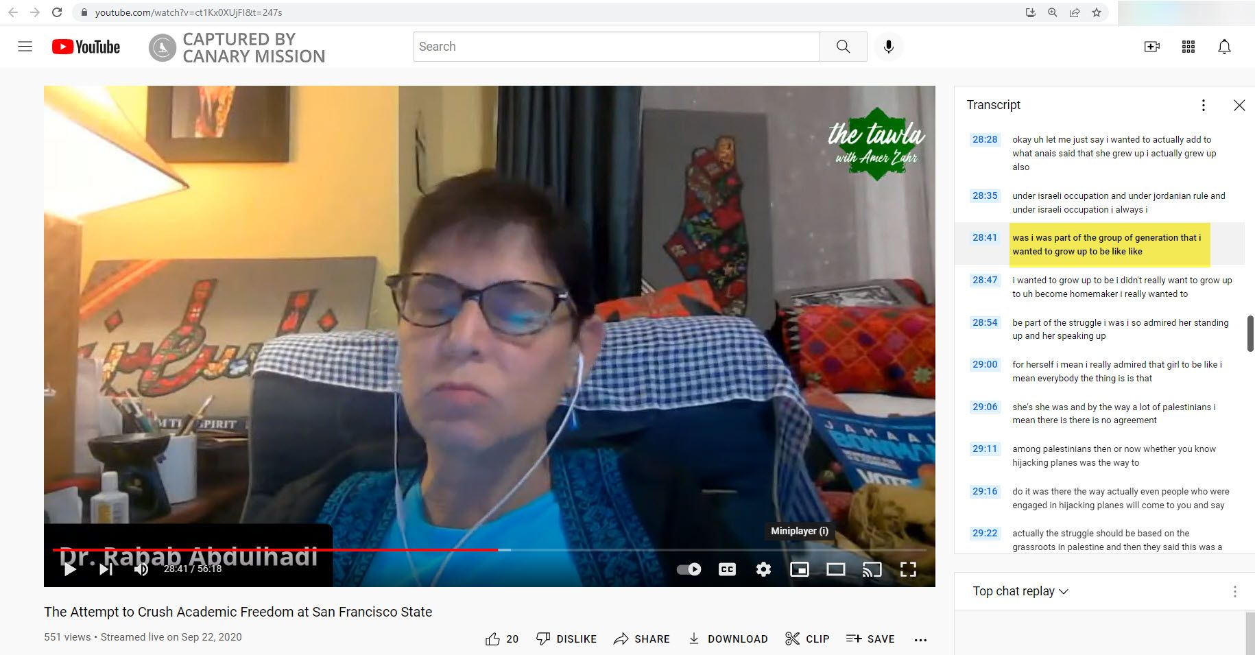 Also on September 22, 2020, Abdulhadi featured [00:04:07] in a live-streamed YouTube video promoting the Khaled event. She said [00:28:41]: “I was part of a group of generation…I wanted to grow up to be like Leila Khaled…I so admired her standing up and her speaking up…”