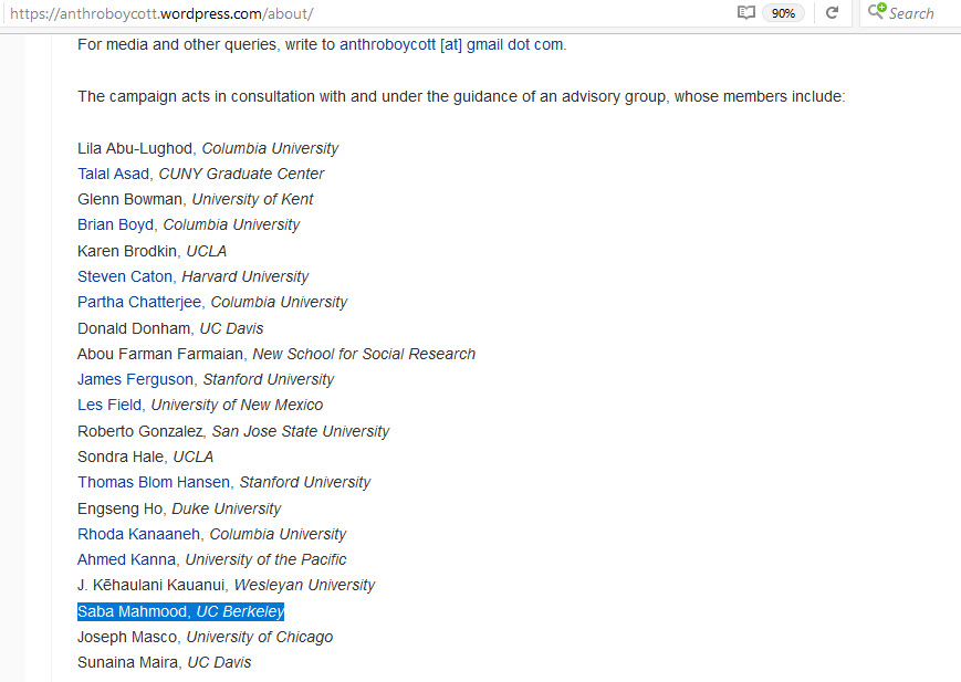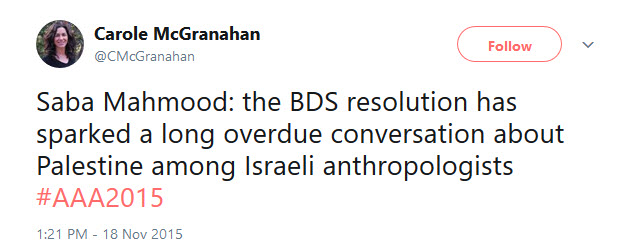 Mahmood is a member of an “advisory group” that guides the organization “Anthropologists for the Boycott of Israeli Academic institutions.”In December of 2014, Mahmood sat on an AAA panel titled “What is the Role of Academia in Political Change? The Case of Boycott, Divestment and Sanctions (BDS) and Israeli Violations Of International Law.”