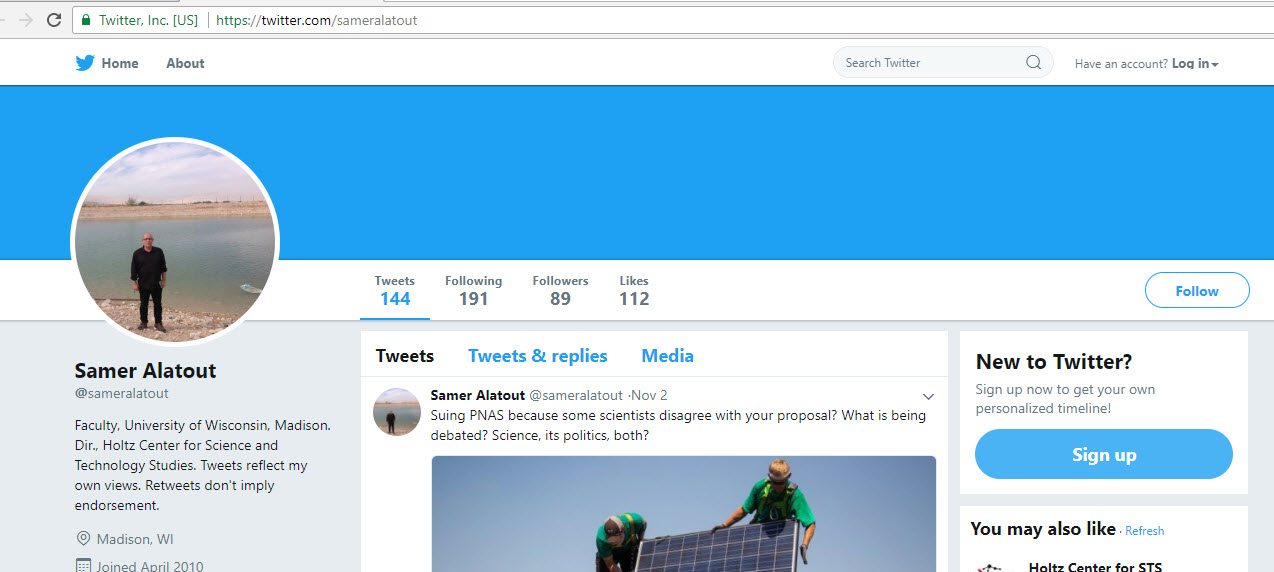 Alatout signed an August 21, 2014 petition in defense of fired professor Steven Salaita. The petition was titled: “A Call to People of Conscience Not to Speak at the University Of Illinois Urbana-Champaign Until Chancellor Wise Honor [sic.] the Contract to Hire Professor Steven Salaita.”In 2014, The University of Illinois withdrew an offer of employment to Salaita after becoming aware of his anti-Semitic tweets. One tweet, posted shortly after Hamas kidnapped three teenage Israeli high school students, read: "You may be too refined to say it, but I’m not: I wish all the f**king West Bank settlers would go missing.” In 2017, Salaita posted to Facebook: “People ask if I would go back in time and change anything. I would not…I will die unapologetic.” In February 2019, Salaita stated that he had become a school bus driver in the Washington, D.C., area.
