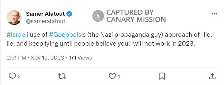 On November 15, 2023, Alatout tweeted: “#Israeli use of #Goebbels's (the Nazi propaganda guy) approach of ‘lie, lie, and keep lying until people believe you,’ will not work in 2023.”Hatred of Israel and America