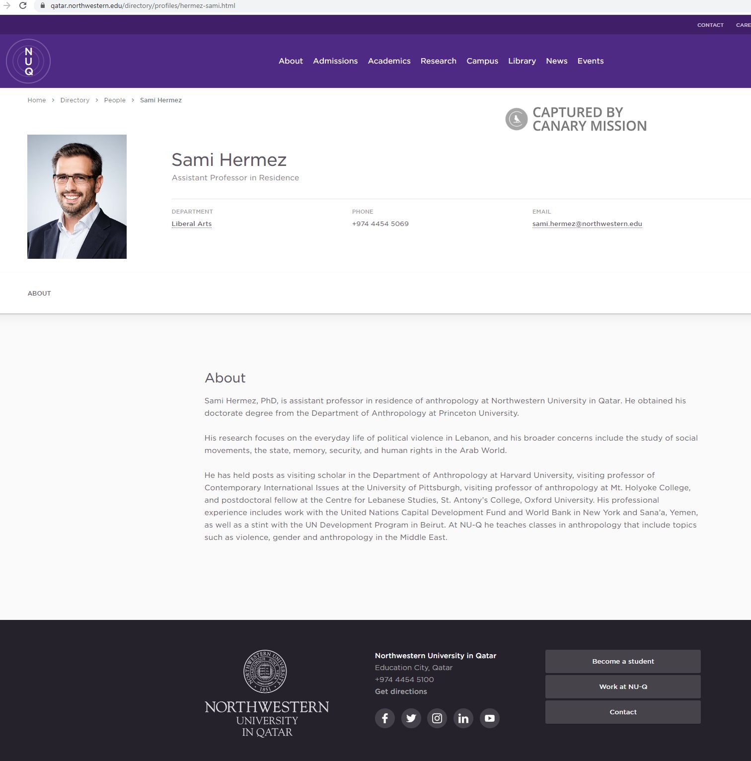 Sami Hermez, an NU-Q Professor who taught the 2018-2019 NU-Q courses “Anthropology of Palestine” and “Advanced Topics: Violence/Power/Resistance,” has promoted a terrorist and demonized Israel.
