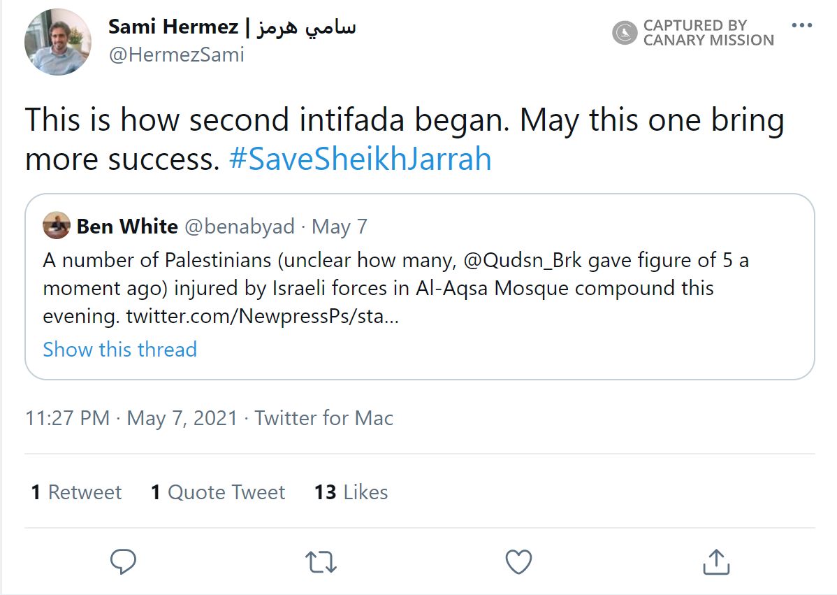 On May 7, 2021, Hermez tweeted: “If you're sitting on the sidelines, speak out against normalization, and mobilize a boycott campaign in your country. Check out http://bdsmovement.net for targets and get in touch for ideas. #SaveSheikhJarrah.”