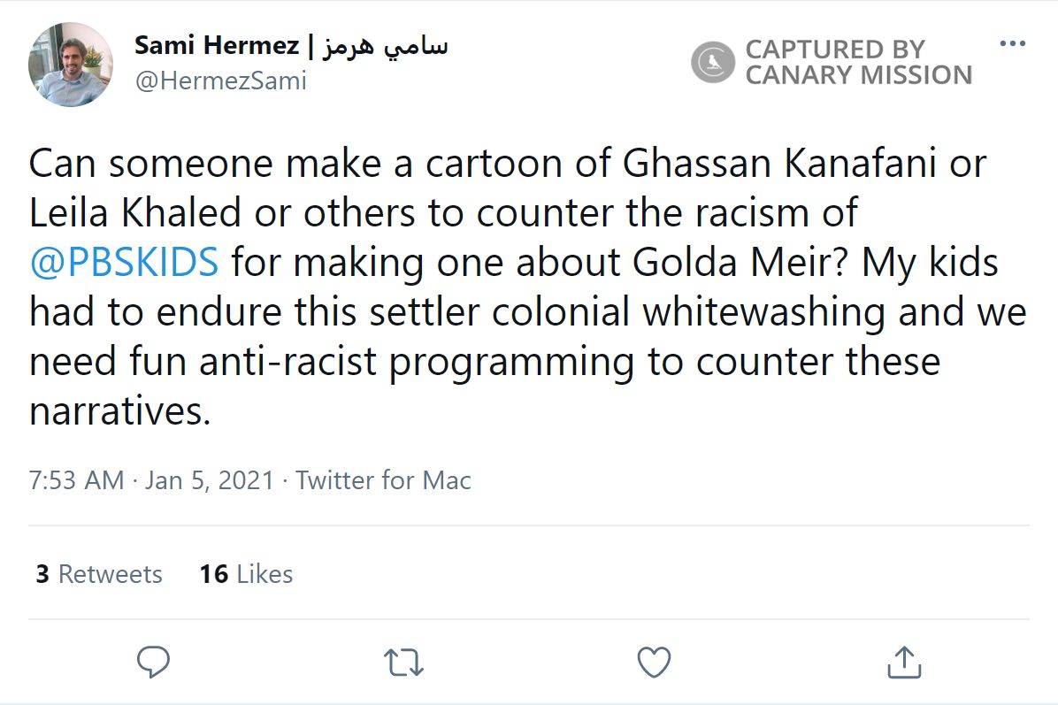 On January 5, 2021, Hermez tweeted: “Can someone make a cartoon of Ghassan Kanafani or Leila Khaled or others to counter the racism of @PBSKIDS for making one about Golda Meir? My kids had to endure this settler colonial whitewashing and we need fun anti-racist programming to counter these narratives.”