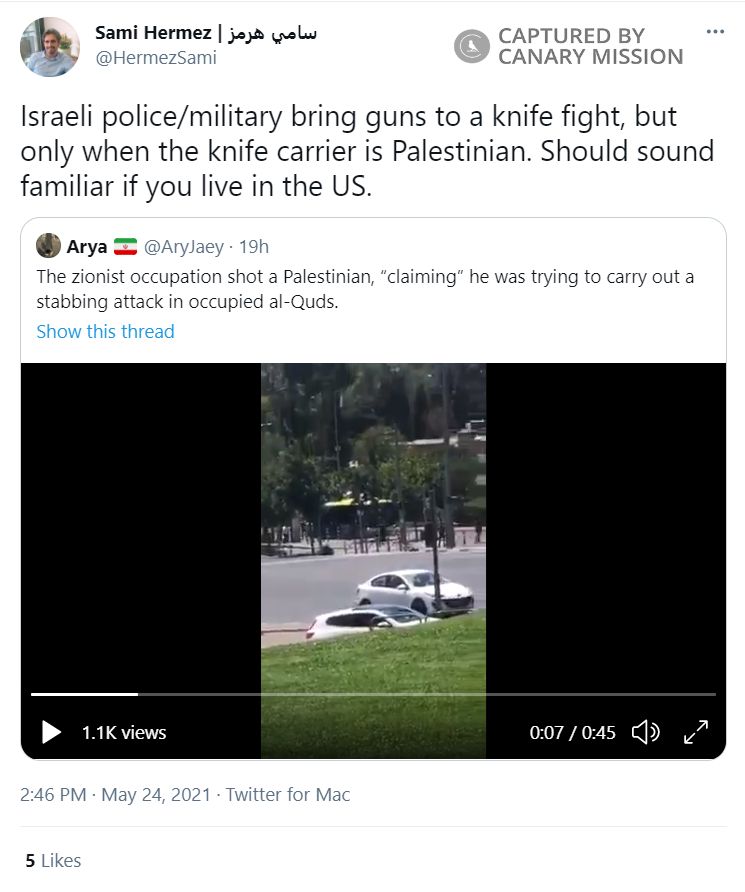 Hermez tweet included a tweet that said: “The zionist occupation shot a Palestinian, ‘claiming’ he was trying to carry out a stabbing attack in occupied al-Quds.” The tweet included a video of a person apparently being shot by police.