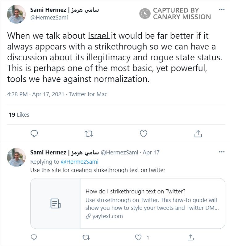 On April 17, 2021, Hermez tweeted: “When we talk about I̶s̶r̶a̶e̶l̶ it would be far better if it always appears with a strikethrough so we can have a discussion about its illegitimacy and rogue state status. This is perhaps one of the most basic, yet powerful, tools we have against normalization.”